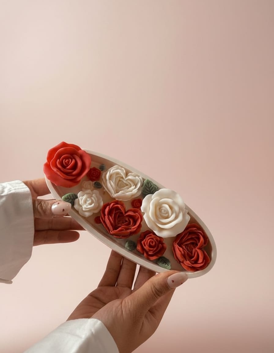A beautifully handcrafted aroma candle tray filled with detailed rose flowers in soft red and ivory tones. Designed like a blooming garden, this candle tray adds warmth, fragrance, and elegance to your space—perfect for gifting or elevating your home décor with a romantic touch.